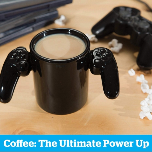 Ручки выполнены в стилистике геймпада, для настоящих киберспортсменов. А надпись на донышке символично подчеркивает, что напиток вы уже прикончили, пора начинать снова.